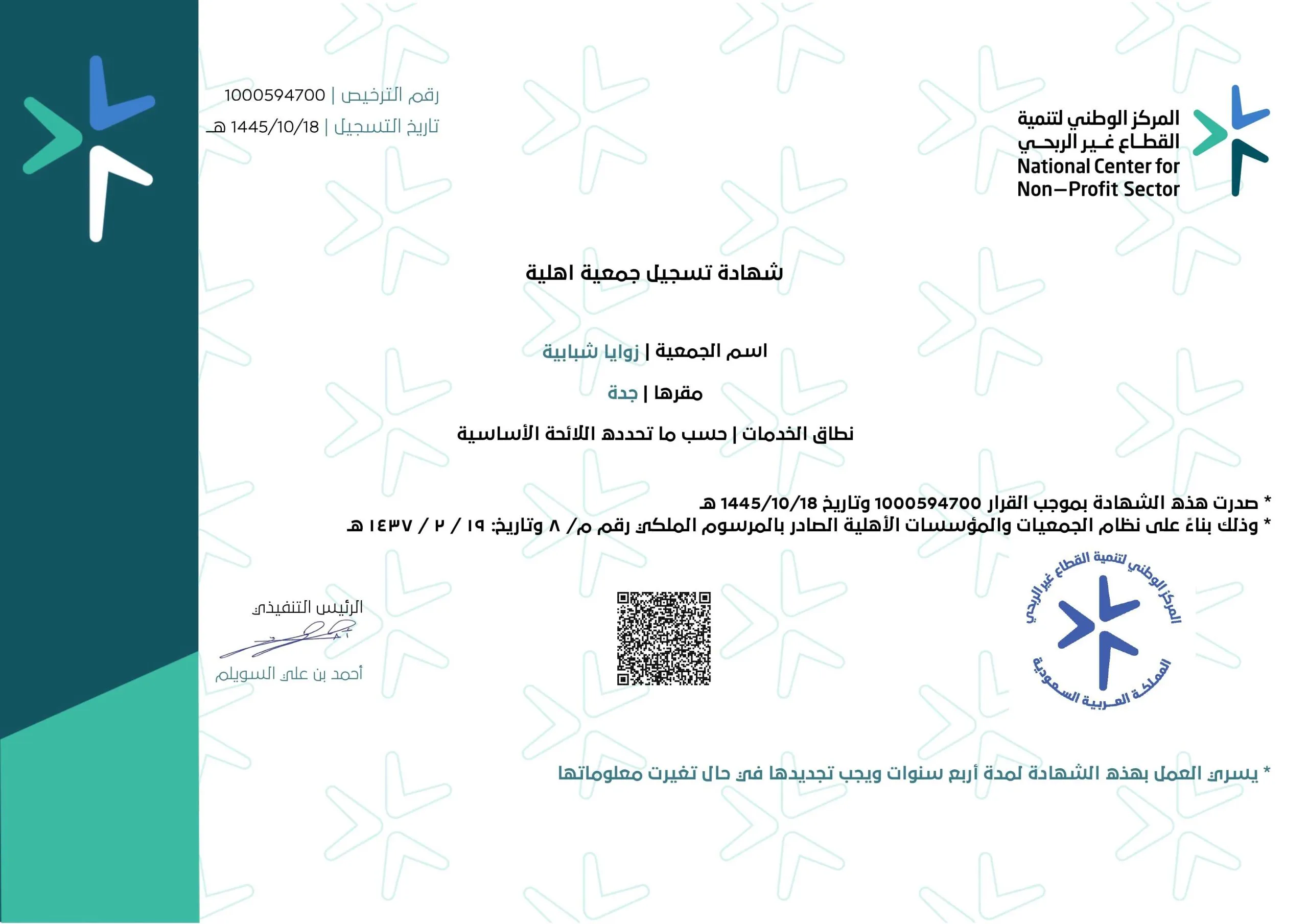 جمعية زوايا الشبابية كيان مجتمعي يسعى اﱃ تمكين الشباب فكريا ومهاريا عبر برامج نوعية واشتراكات استراتيجة تسهم في نهضة المجتمع وتحقيق التكامل